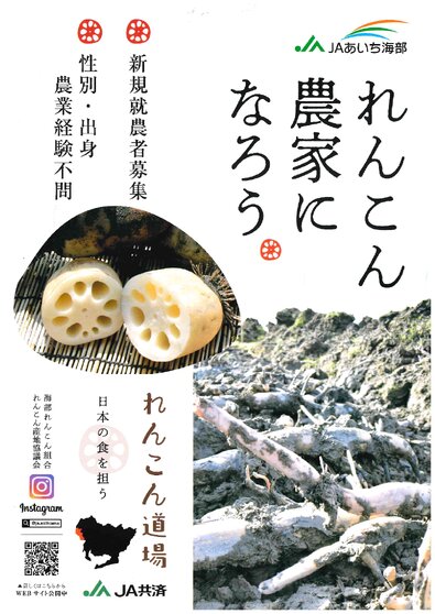 | 応募資格 | 18歳以上45歳未満で研修終了後は「れんこん生産者」として就農意志が明確な方。性別・出身・農業経験の有無は問いません。 ※運転免許必須(研修先までは車で通っていただくため) ※就農予定時の年齢が49歳以下の方は「就農準備資金」(12万5千円/月、最長2年)の申請が出来ます。(申請には条件があります。) 研修終了後は原則愛西市内で就農できる方。また、「海部れんこん組合」へ加入し、収穫物を共選出荷できる方。 |