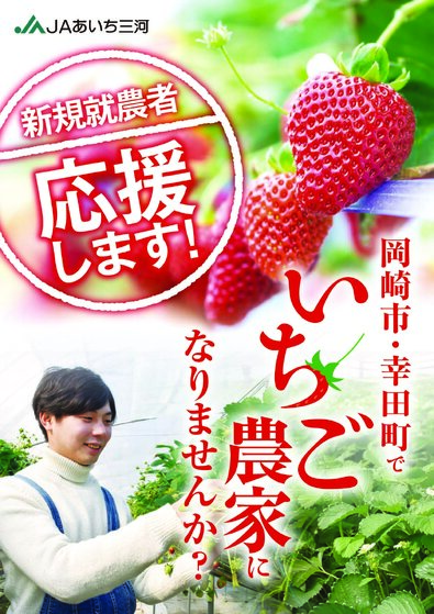 | 応募資格 | ・満18歳以上で研修終了後、JAあいち三河管内でいちご生産者として、就農意思が明確で、家族の同意を得られる方 ・就農時は岡崎市いちご部会・幸田町いちご組合に加入 ・研修時は通年で研修先へ自家用車等で通えること |